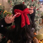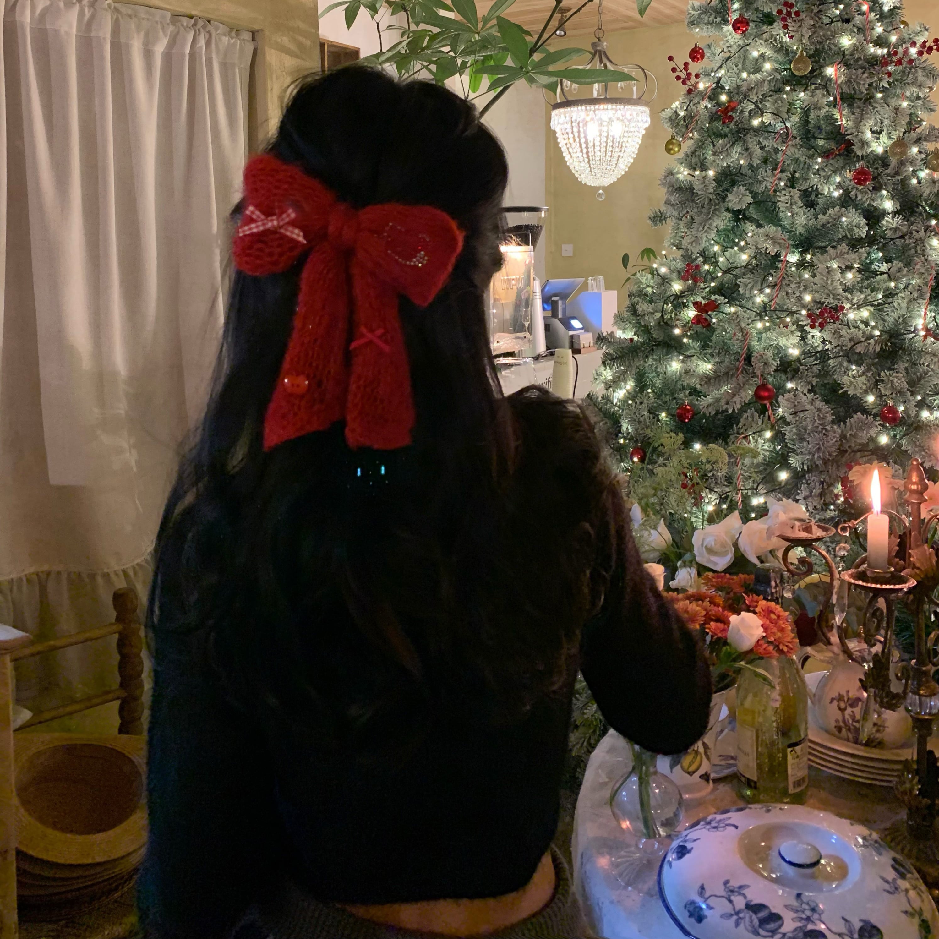 キラキララインストーン付き❤赤いモヘアリボンヘアピン
